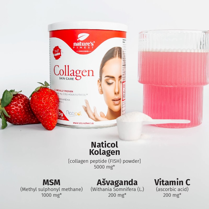 Ingredients: Naticol® hydrolysed fish collagen powder (50%), maltodextrin, MSM (methylsulfonylmethane), ashwagandha powder, natural strawberry flavour (2%), beetroot powder (1%), stabilizer: cellulose powder, vitamin C, Sweetener: steviol glycosides from stevia
