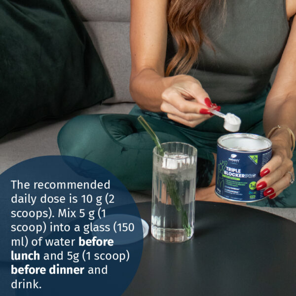 The recommended daily dose is 10 g (2 scoops). Mix 5 g (1 scoop) into a glass (150 ml) of water before lunch and 5g (1 scoop) before dinner and drink.