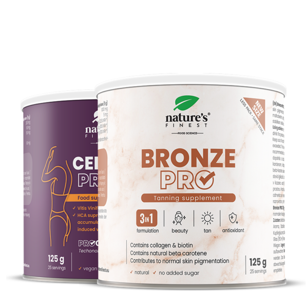 • Bronze PRO: Tanning supplement with a unique 3-in-1 formulation – Contributes to the normal pigmentation of the skin and hair, help protect cells from oxidative stress