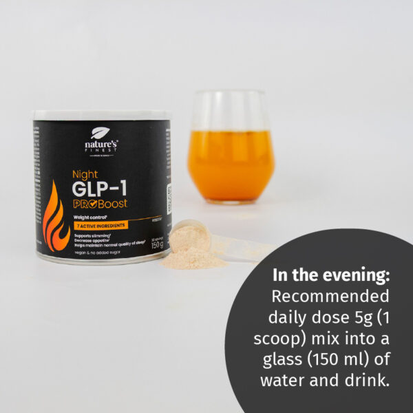 Night GLP-1 ProBoost: Recommended daily dose 5g (1 scoop) mix into a glass (150 ml) of water and drink. For precise measuring we suggest weighing.