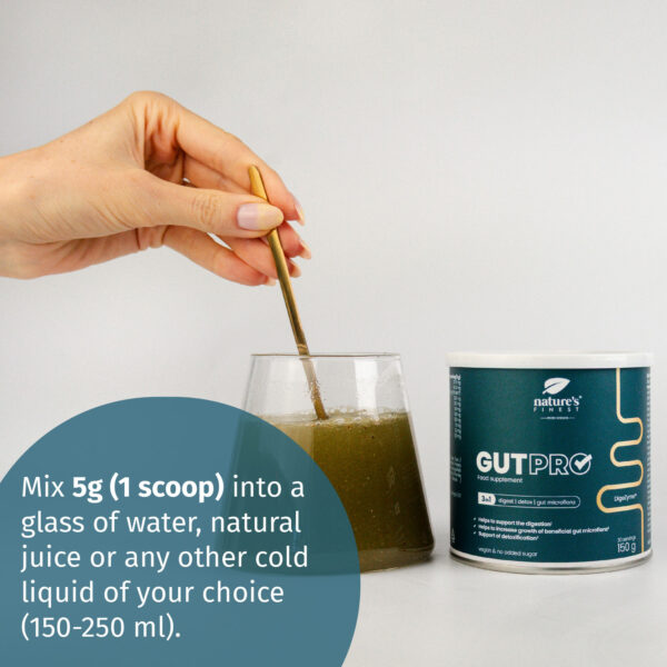 Mix 5g (1 scoop) into a glass of water, natural juice or any other cold liquid of your choice (150-250 ml). Consume the drink immediately after preparation, as it thickens over time. If desired, you can also stir the powder into a smoothie or yogurt.
