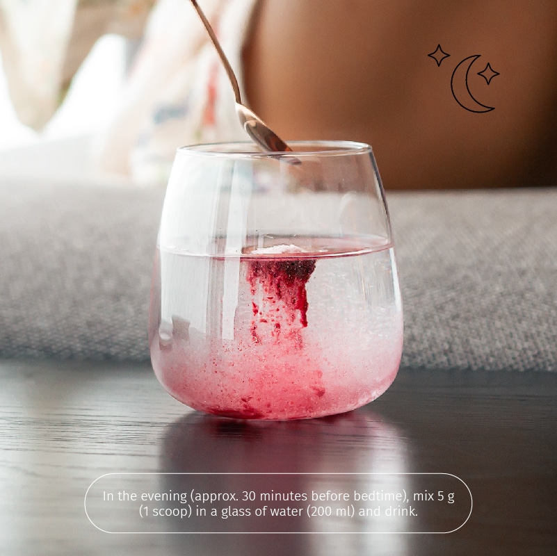 In the evening (approx. 30 minutes before bedtime), mix 5 g (1 scoop) in a glass of water (2dl) and drink.