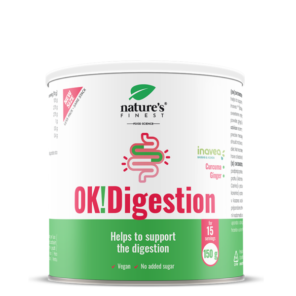 OK!Digestion with the patented Inaveo™ formula selectively increases beneficial microflora and helps restore its balance. With the added power of rosehip, turmeric and ginger, it supports the digestive system and boosts vitality and energy.
